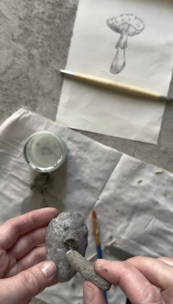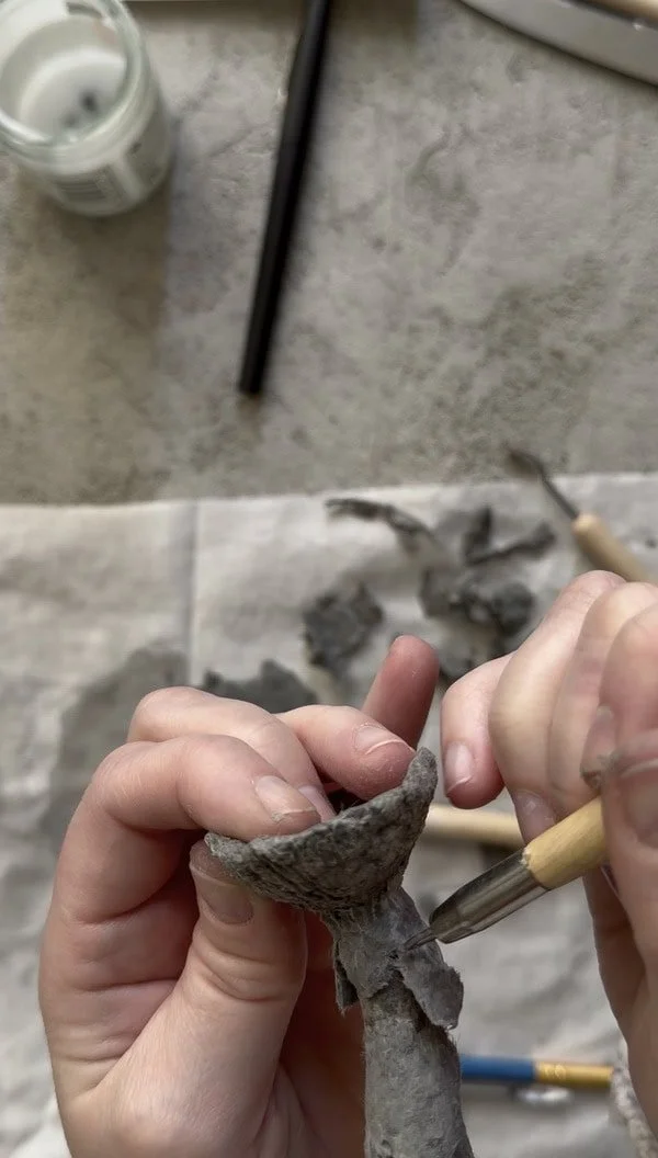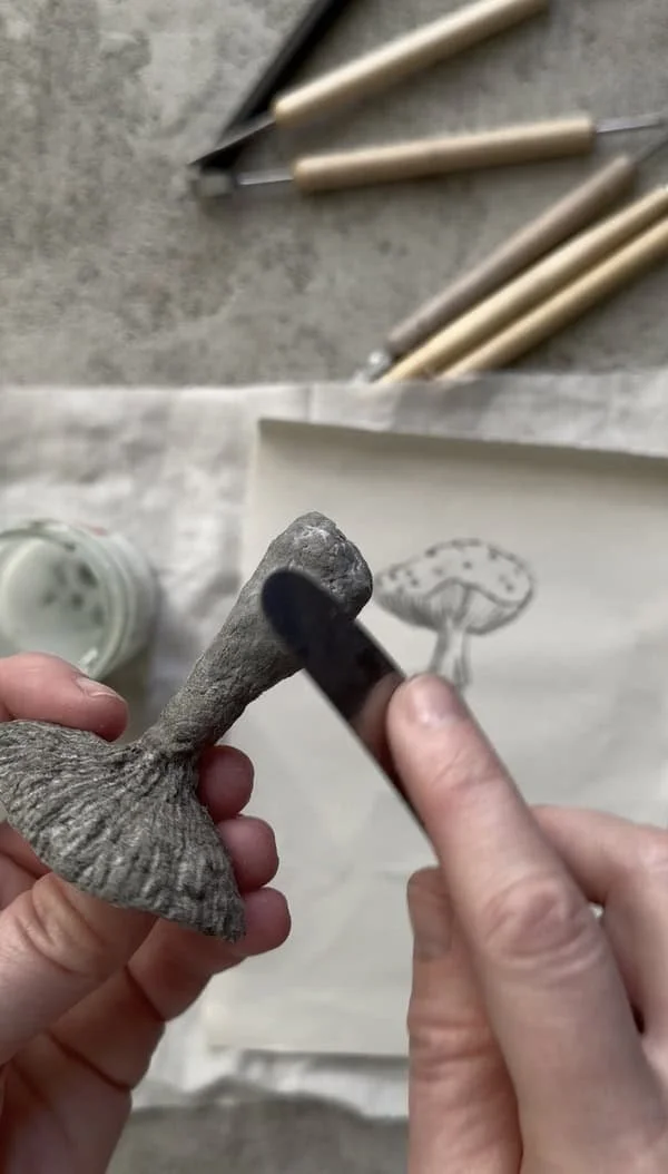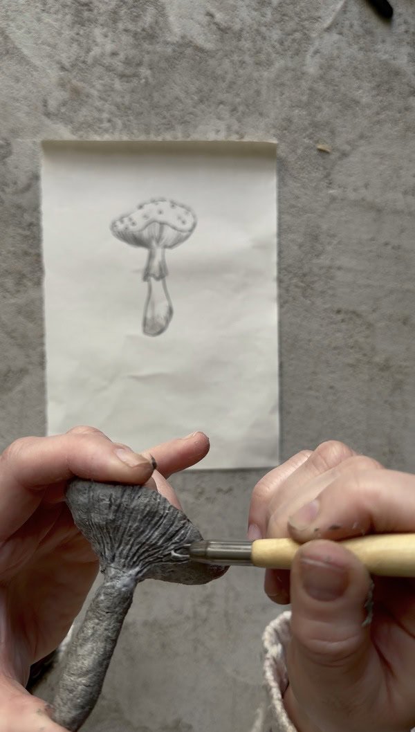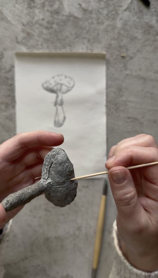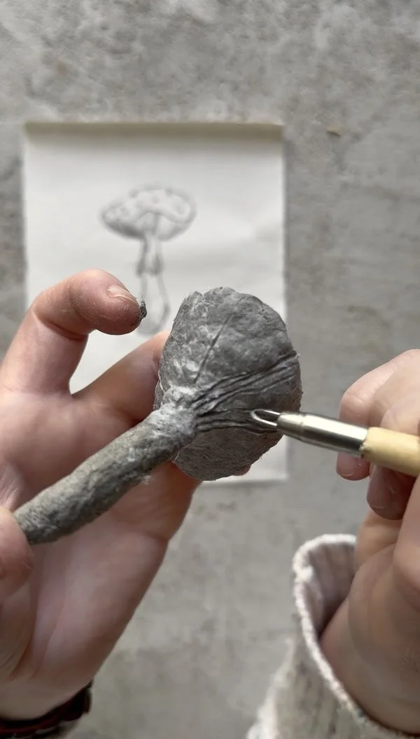 At this stage the cap and stem may still feel slightly fragile, because the connection hasn't fully hardened yet. Work slowly and support the mushroom with your fingers. If the stem pops off — don’t worry! Just glue it back on, blend the pulp again, and continue carving. Every crack, tear or softness can be repaired immediately — that’s the beauty of paper pulp.