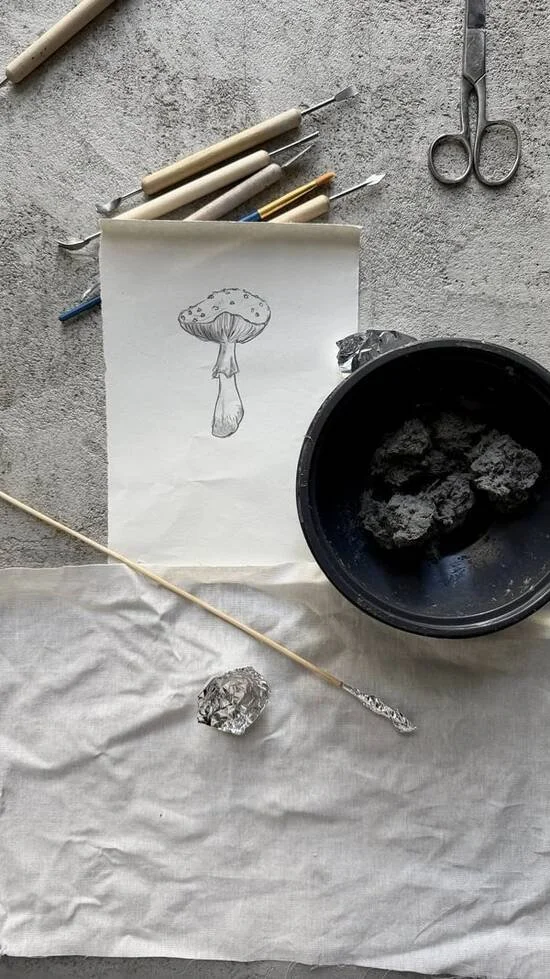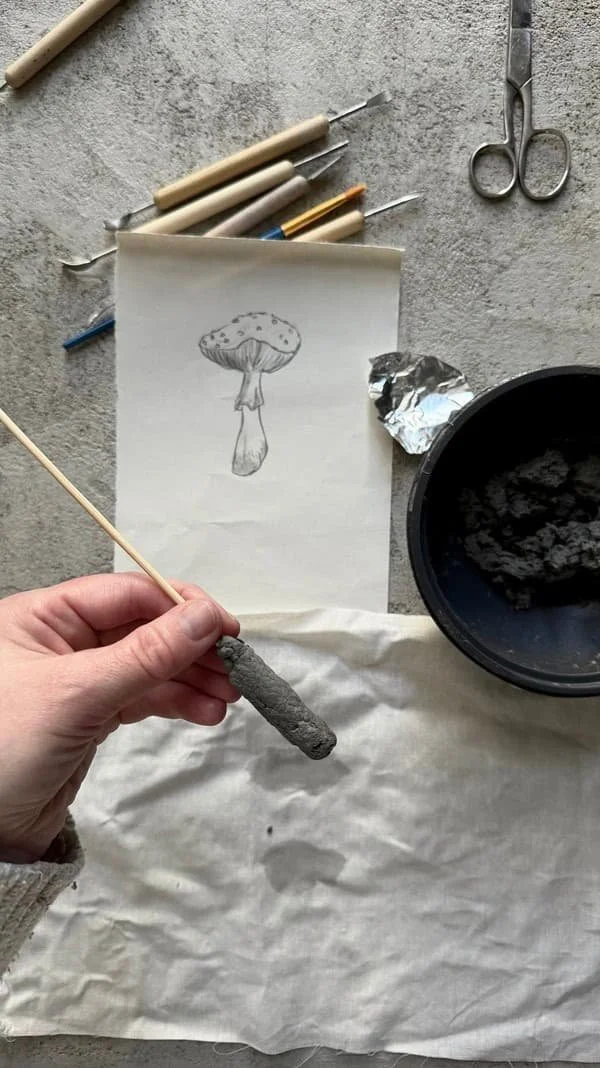 I started the process by making a few loose mushroom sketches on paper — nothing precise, just a quick outline to follow. A sketch is not required, but it helps a lot with proportion, especially if you want your ornaments to stay small and light. Think of it as a gentle guide rather than a blueprint.