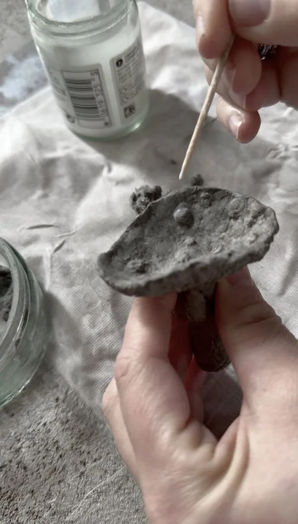 When you’re happy with the overall shape (just the form, without gills yet), you can attach the stem. Brush the top of the stem with a thin layer of PVA glue so it bonds well with the fresh underside of the cap. Press the pieces together gently and blend the edges so the connection looks natural and seamless.