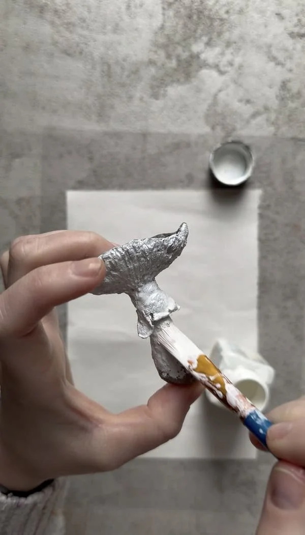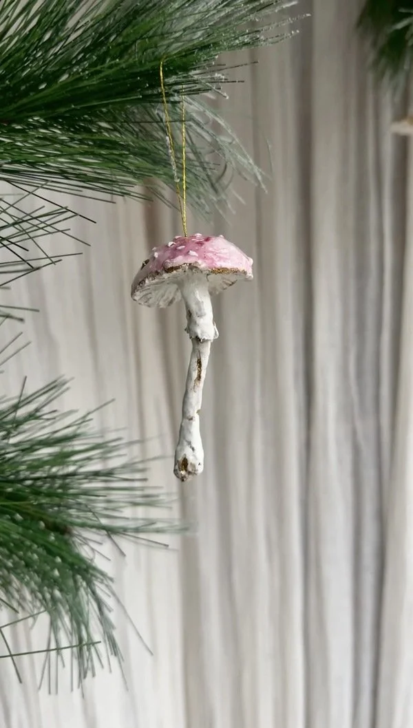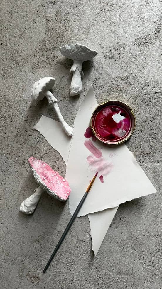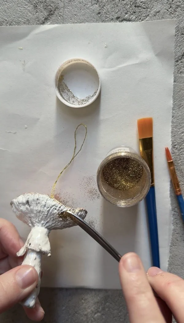 I wanted my mushrooms to have a delicate porcelain-like finish, the kind you might find on vintage holiday ornaments. I’ve used this effect before in another project, which you can see here: (add link).