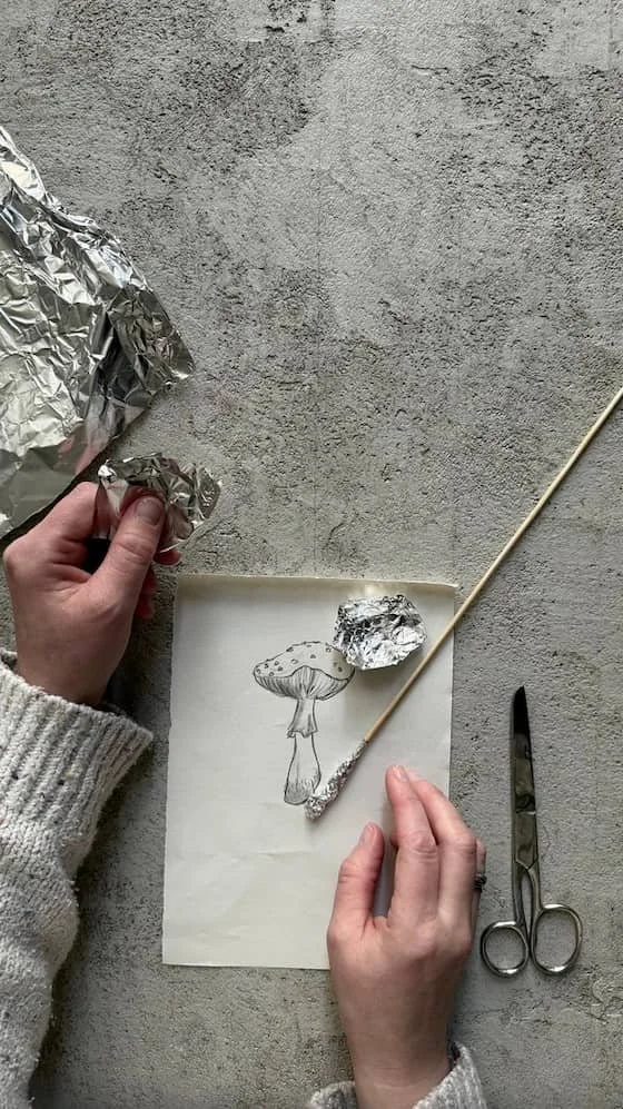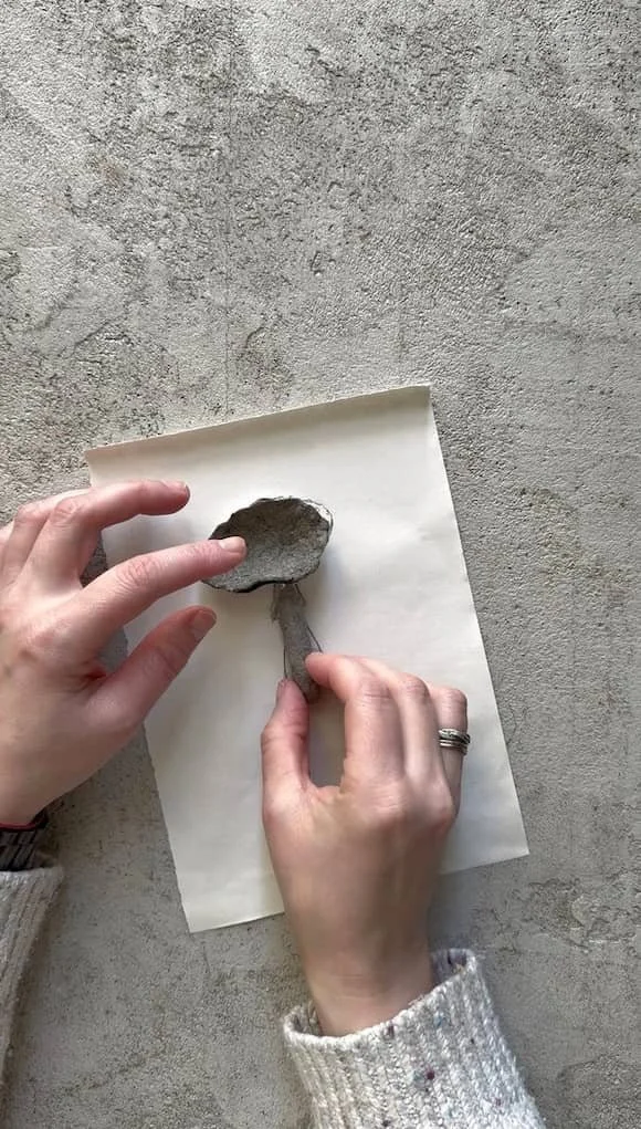 You don’t need special tools to form the cap — everyday objects work beautifully. For one of my mushrooms, I shaped the foil over a small rubber dog toy, and the largest cap dried perfectly resting on the back of a big spoon. Feel free to experiment with bowls, balls, measuring cups — anything with a gentle curve can become a mould.