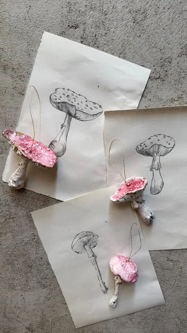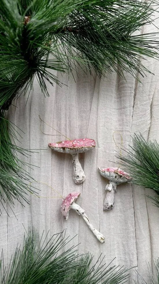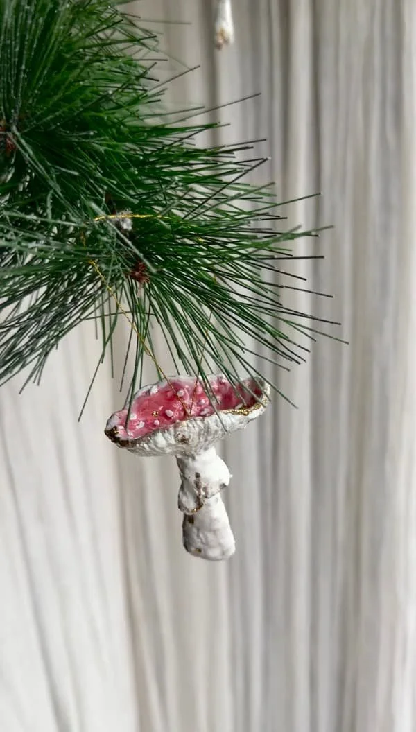 For a while now I’ve been feeling that Christmas decorations gain real value only when there are human hands and a story behind them. So this year I decided to start my own tradition — creating ornaments that I can share with my loved ones, pieces that will stay with us for years to come. The first ones to take shape were little paper mushrooms, pretending to be porcelain, painted softly like watercolours. Sculpted by hand, light and fragile in appearance, yet surprisingly durable. Tiny woodland charms for winter branches.