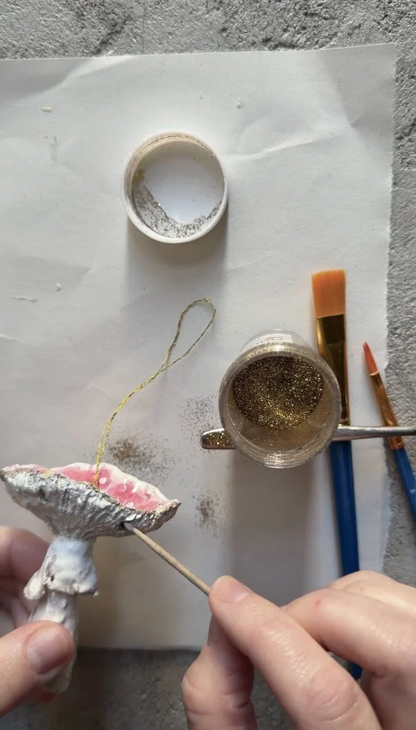After painting the mushrooms and adding the hanging strings, I realised that a hint of glitter would make them feel even more festive.