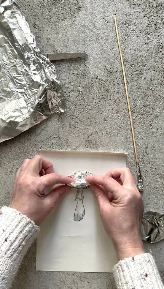 Pinch and press the foil until you get a rounded top and a subtle, curved underside. Don’t worry about perfection — mushrooms are wonderfully organic, irregular, and each one will develop its own personality as you sculpt.