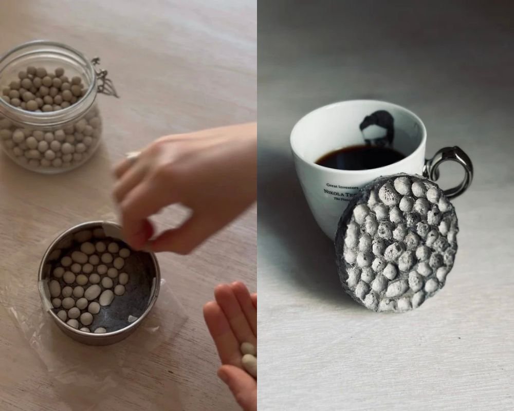 The patterned dents it leaves are rhythmic and sculptural, like a constellation of tiny marks mapped across the surface. Each press feels purposeful yet unexpected — a reminder that ordinary objects can have extraordinary effects when we slow down and explore them.