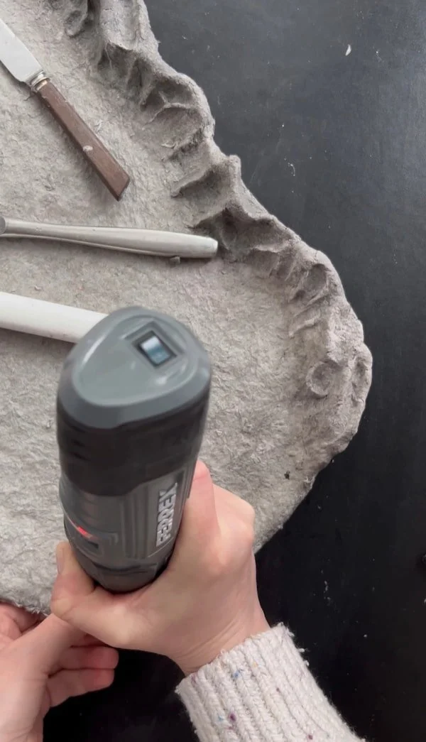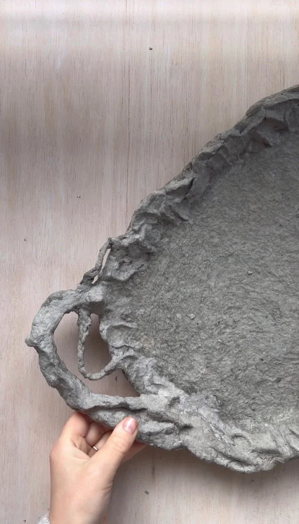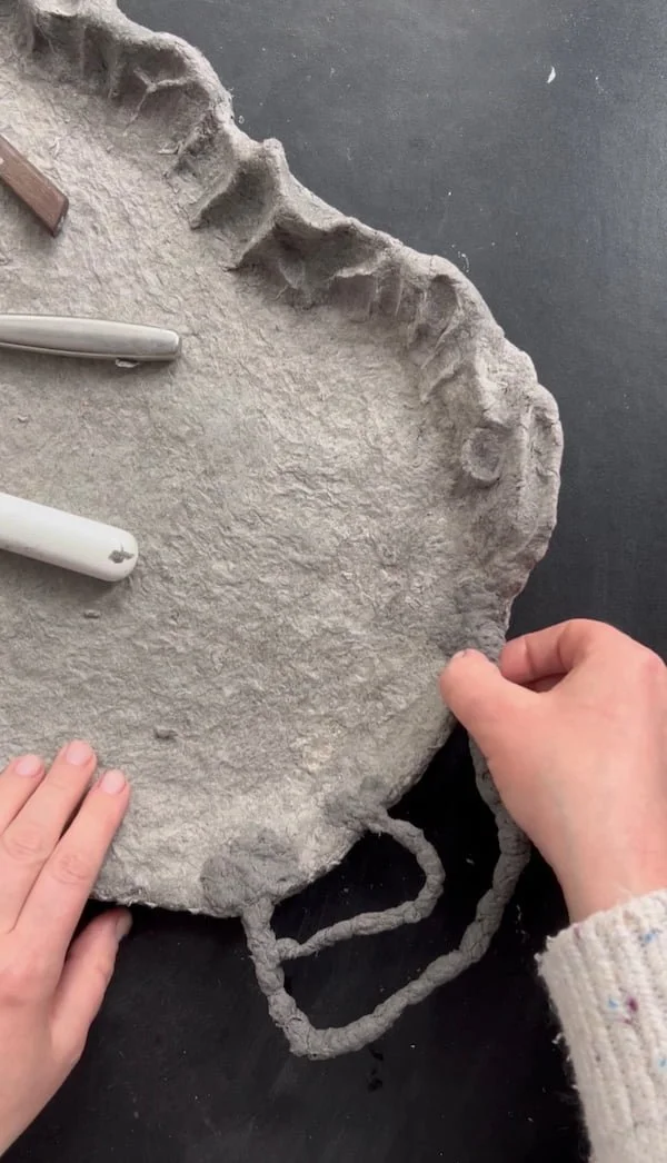 To create organic, sculptural forms, we need to build up the rim of the tray by adding more paper pulp. Instead of working around the entire edge at once, I recommend shaping it in sections. This process takes time, and if you need to step away, the pulp may start drying before you’ve finished forming it. Working in smaller areas gives you better control over the texture and shape.