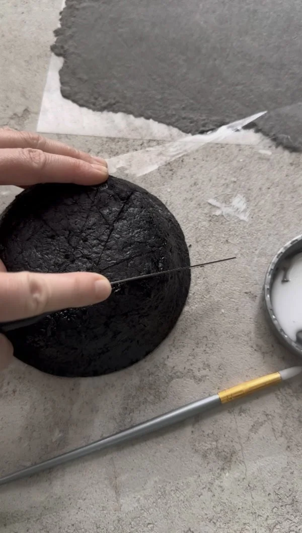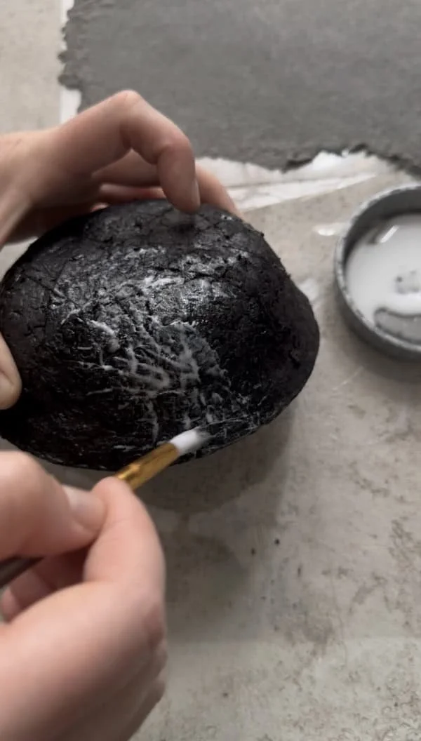 Before applying the paper pulp sheet, we need to prepare the surface of the object. Lightly score the base using a knife or another sharp tool — this will create small grooves that help the pulp grip better. Once that’s done, apply a generous amount of PVA glue over the entire surface to ensure strong adhesion.