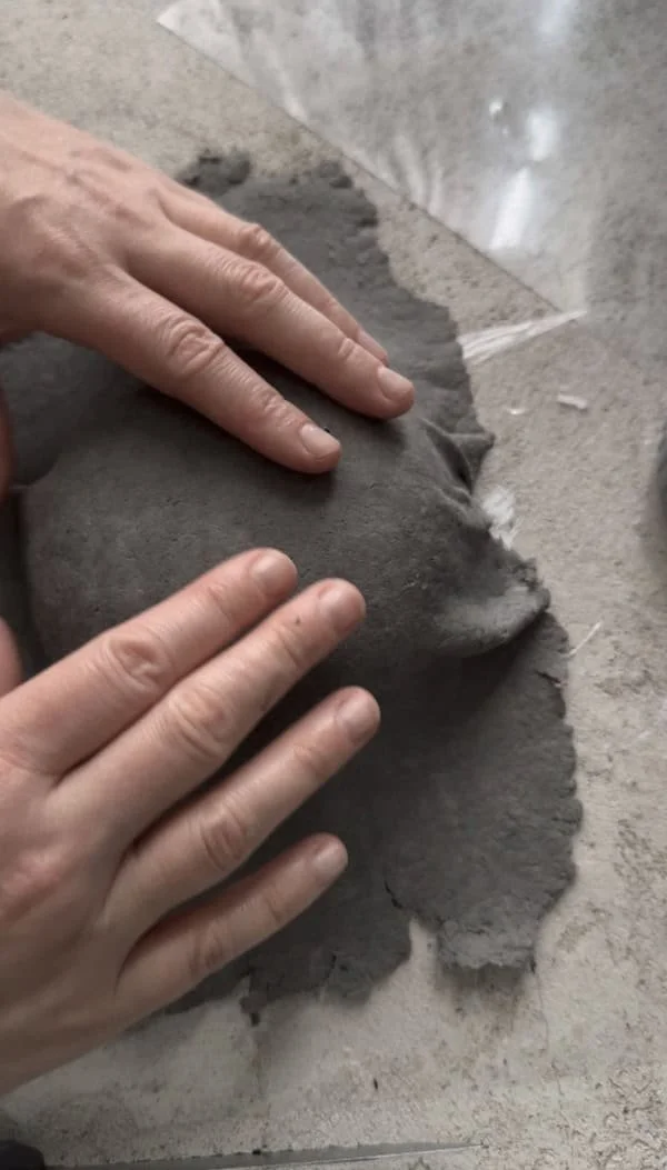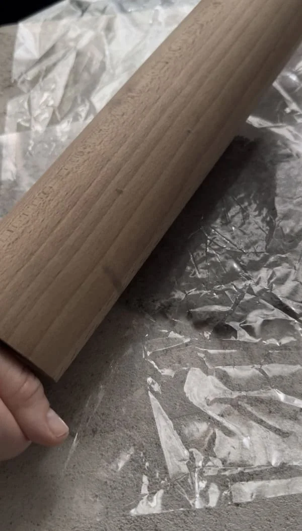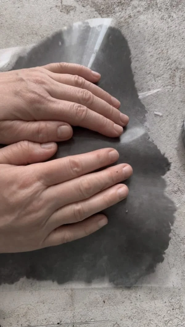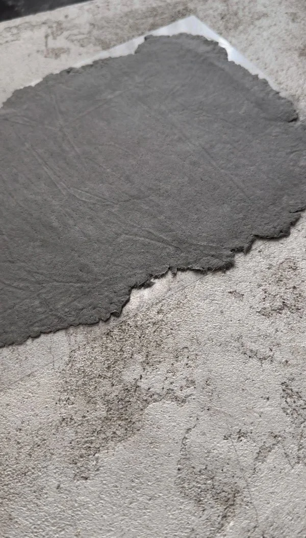 We start by rolling out the paper pulp into a very thin, smooth sheet. To do this, I like to use old materials I already have at home — for example, a piece of cotton fabric, a transparent foil like cellophane, or even a binding cover. A simple rolling pin works perfectly for this step.