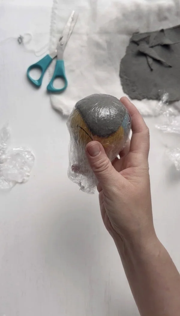 After about 30 minutes, carefully remove the cling film from the ball, making sure not to damage the structure. Then, gently peel the film away from the paper pulp.